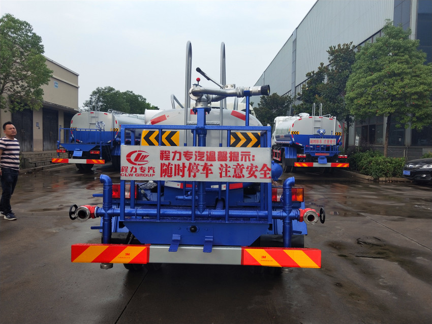 改裝配置:罐體用4MM碳鋼板制作,罐內隔板具有防波作用,以減低汽車行駛時罐體液體的沖擊。整車帶一個專用灑水泵(垂直最大吸程6米),灑水寬度14米,射程28米。多功能灑水車配備2個前沖(噴)(能將路面泥巴、塵土、垃圾沖干凈);2個后灑(能均勻地將水灑在路面,一次灑水寬度14米)、2個側噴(花灑)(能均勻地將路旁綠化帶澆灌)、帶1個后工作平臺,平臺上安裝1個綠化灑水高炮(灑水炮可全方位旋轉,可連續(xù)調成直沖狀、大雨、小雨、毛毛雨,霧狀可調節(jié)沖洗高大樹木),引水時間<5min,流量90m3/h。帶1個消防接頭,帶1個自流閥,1個過濾裝置、人性化爬梯及側防護欄,安裝灑水音樂喇叭。