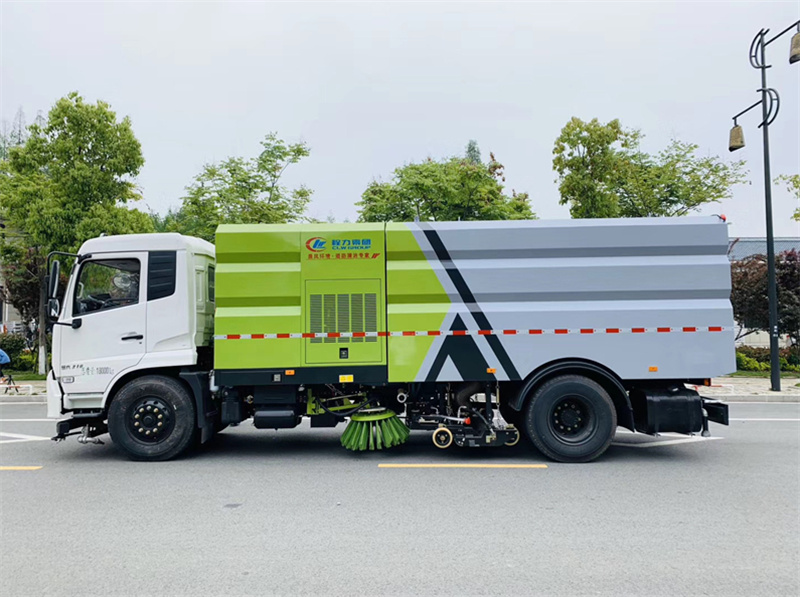 ● 國六東風(fēng)天錦洗掃車清水箱和垃圾箱分體布置,有效空間利用最大化,一次連續(xù)作業(yè)時間長。同時在作業(yè)過程中可通過污水排放裝置對污水進(jìn)行排放,隨時加清水繼續(xù)作業(yè);垃圾箱采用雙油缸自卸卸料,箱內(nèi)同時設(shè)有大流量高壓噴嘴,可快速沖洗垃圾箱